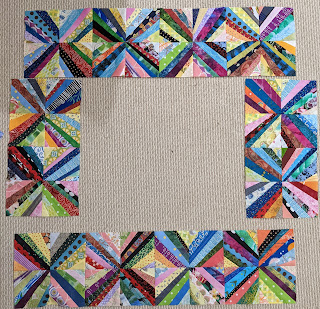 We left off with the center cut two-inches larger than the finished dimensions of the ESS blocks. Remove the paper from the ESS blocks and lay them out as a border. Sew the four sides together so the lengths can be verified. Press the borders carefully {NO ironing and NO steam} because all the sides are bias.